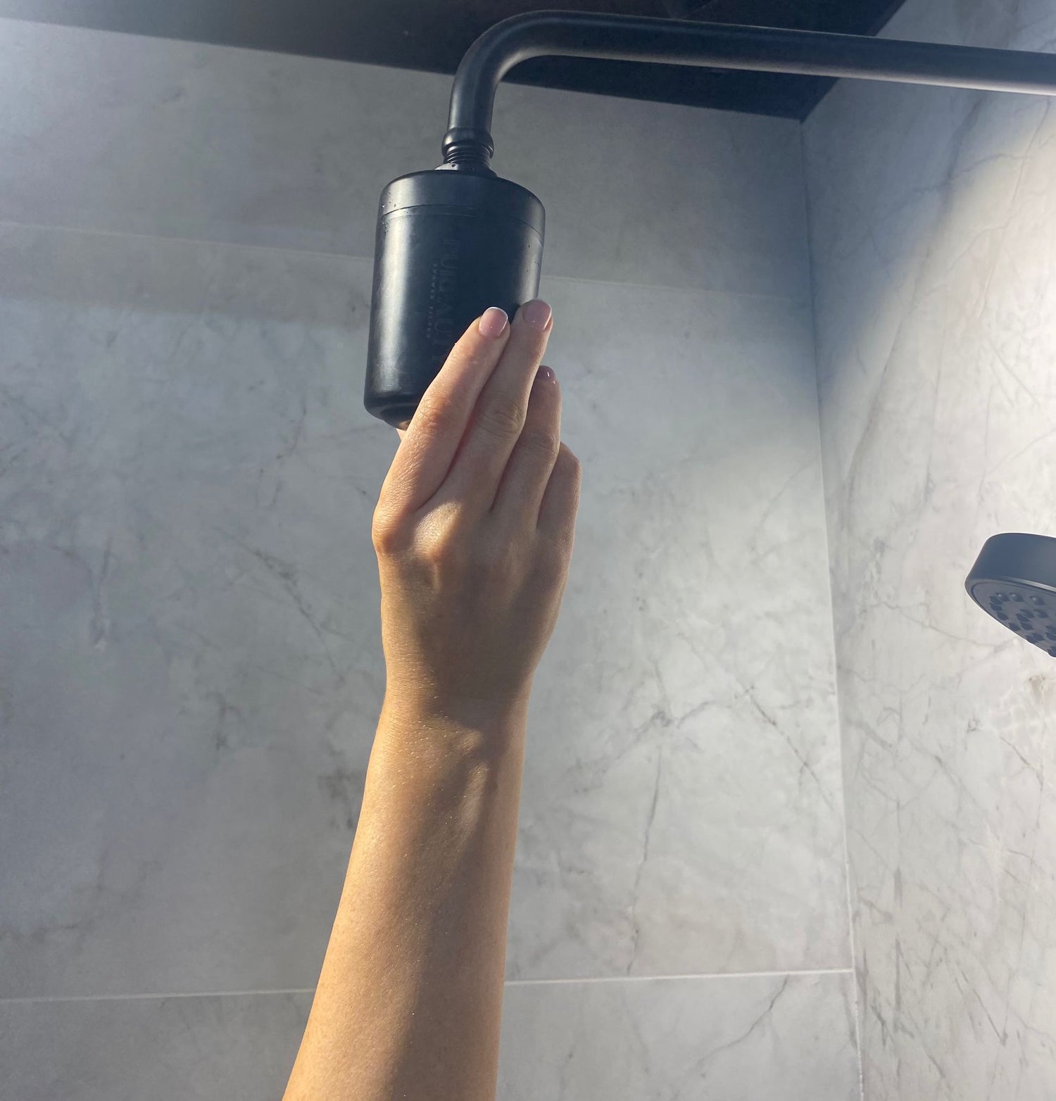 Install your Shower Purifier onto the shower arm by turning it clockwise (hand tight), then install your shower head, also turning it clockwise (hand tight). If additional tightening is required, use a soft cloth to protect the Shower Purifier, and tighten with a wrench.